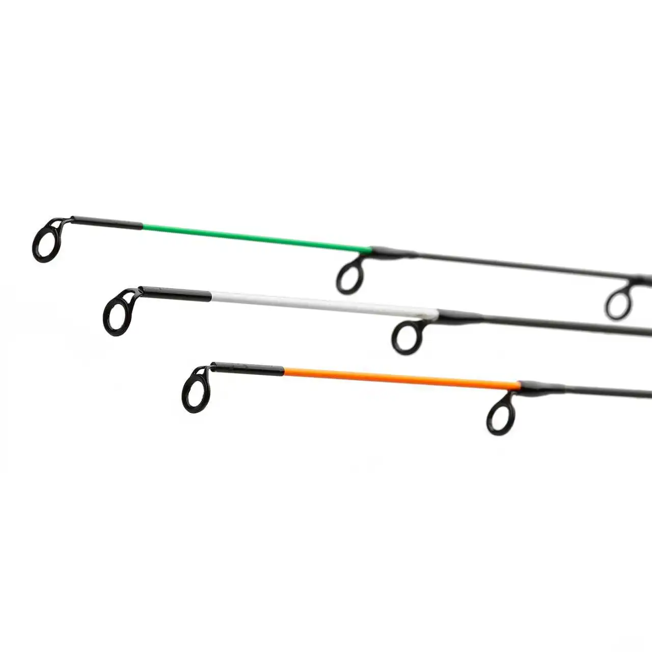 Die 3 Kohlefaser-Einsteckspitzen zeigen zuverlässig auch leichteste Zupfer an und federn Kopfstöße und schnelle Bewegungen der Fische im Drill perfekt ab.